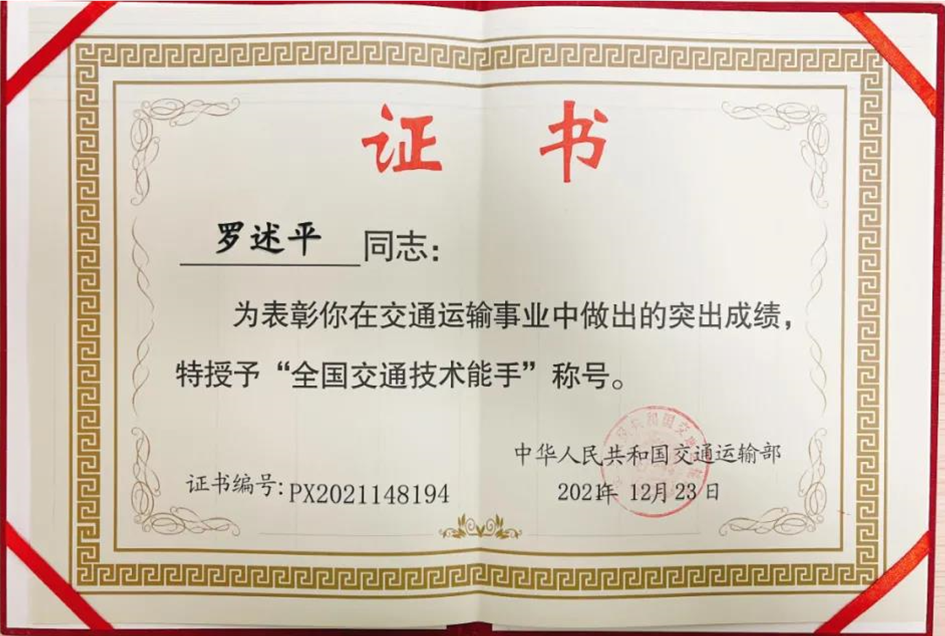 热烈祝贺caozhaihome员工罗述平荣获“全国交通技术能手”称号