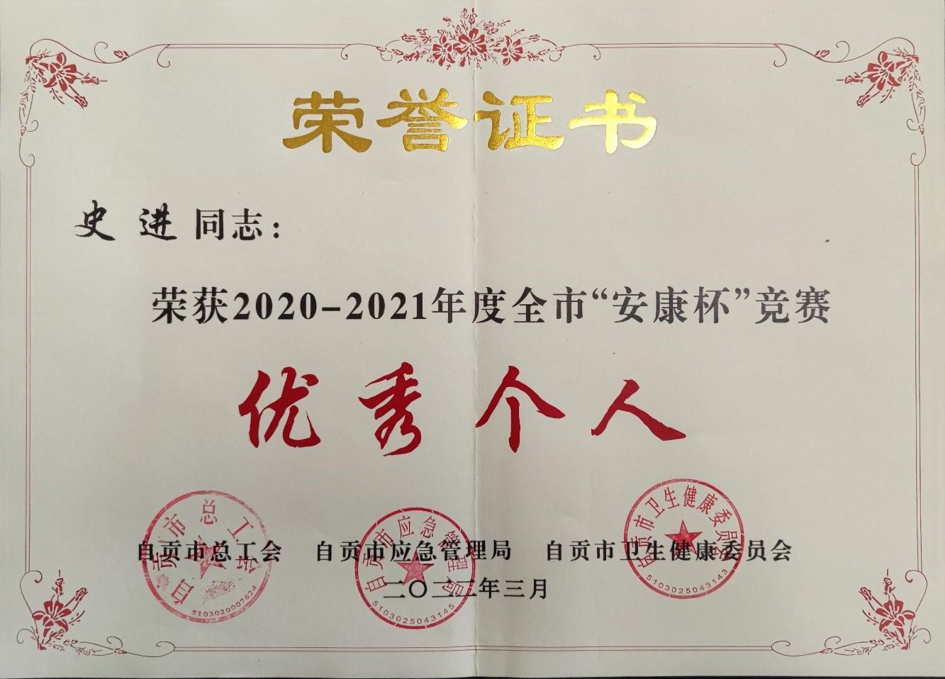 近日,自贡市总工会、自贡市应急管理局、自贡市卫生健康委员会发布《关于2020-2021年度全市“安康杯”竞赛活动评比结果的通报》,taptap正版下载入口安全员史进荣获“优秀个人”。