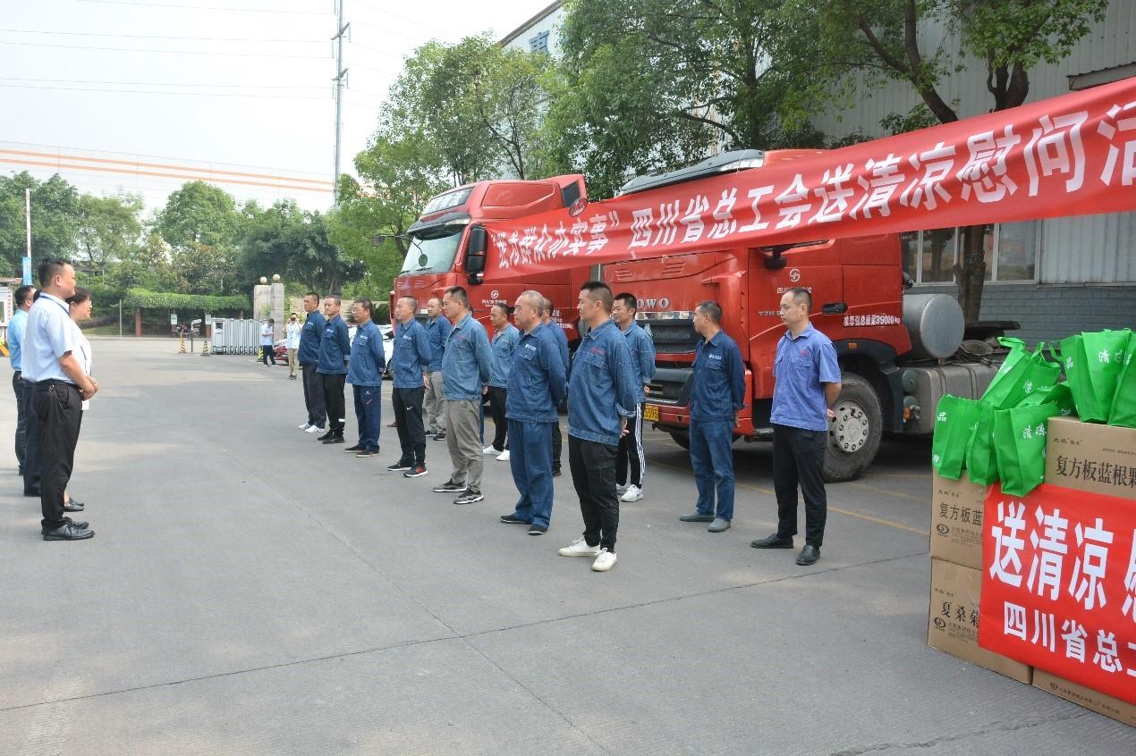 四川caozhaihome总经理徐锋向省、市总工会各位领导的到来表示热烈的欢迎和衷心的感谢!慰问中,徐真彦主任一行来到作业现场,将一份份防暑降温慰问品分别发放到各位货车司机手中,认真听取和了解大家在工资收入、劳动保护、生产生活等方面的情况,希望公司全体货运司机严守职业道德,积极遵守道路交通安全法规,劳逸结合,加强自我保护,防止疲劳驾驶,保障生命健康安全,平安度夏。