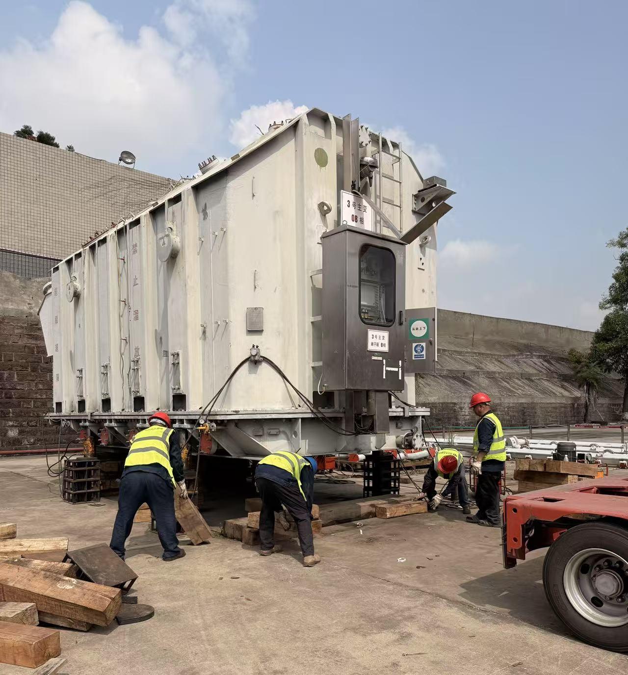 面对重重挑战,大件运输安装部的员工们展现出高度的专业素养和敬业精神。他们提前深入现场勘察,反复推敲制定了周密详尽的作业方案,对每一个操作环节都进行了多轮推演与优化。装车过程中,团队成员分工明确、配合默契,严格恪守操作规程,精准操控设备,确保变压器在平移过程中始终保持平稳。汗水从额头滚滚滑落,浸透了衣衫,但他们始终全神贯注,每一从此动作都严谨规范,不曾有丝毫懈怠。